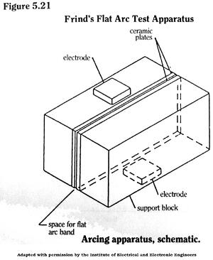 In terms of practical circuit breaker design, we desire fast time constant arcs. Fast arcs will fully collapse at a current zero crossing and thus not be subject to thermal reignition when the arc contact voltage redevelops. From the arc thermal time constant expression (5.36), we see that in order to obtain a fast arc we need only confine the arc in narrow arc channels. The arc time constant is seen to vary as the square of the channel width. To confirm this theoretical prediction, Frind [5.11] conducted careful measurements of the time constants of flat arcs using the apparatus shown in Figure 5.21.